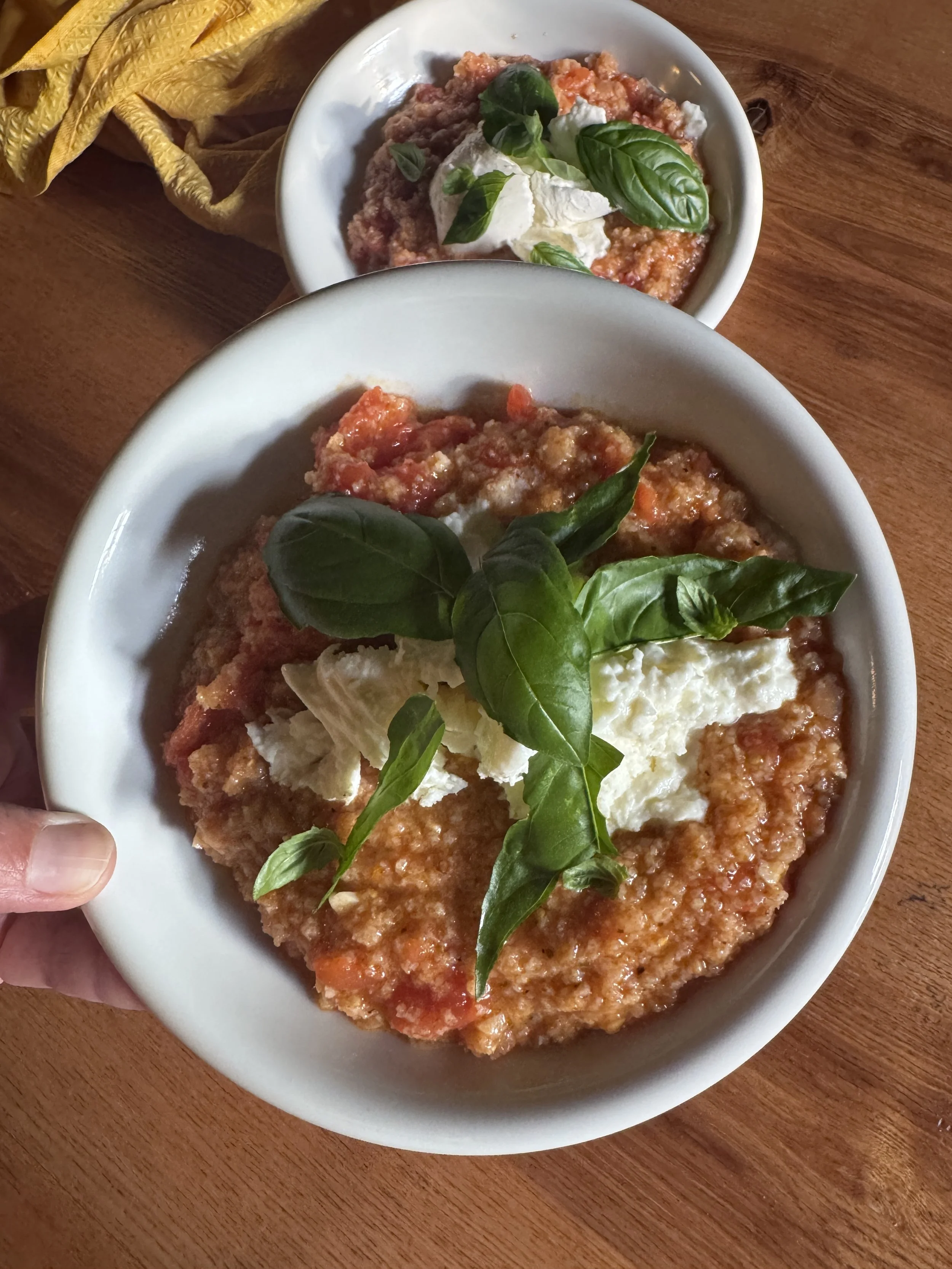 I wasn’t planning on delving into bread soups as I felt like it was a winter thing, but at an amazing restaurant in Siena we were served Pappa al pomodoro cold, as a pre-starter. It was such a beautiful way to awaken the taste buds. It’s more of a porridge than a soup texture ( it actually translates to tomato porridge). and although you can use canned tomatoes, why would you when, here, the produce is so amazing. I had no onions and no stock so used what I could find in the condiment cupboard to add some depth - A tiny splash of soy, oregano, steak seasoning and tiny dried chillies.