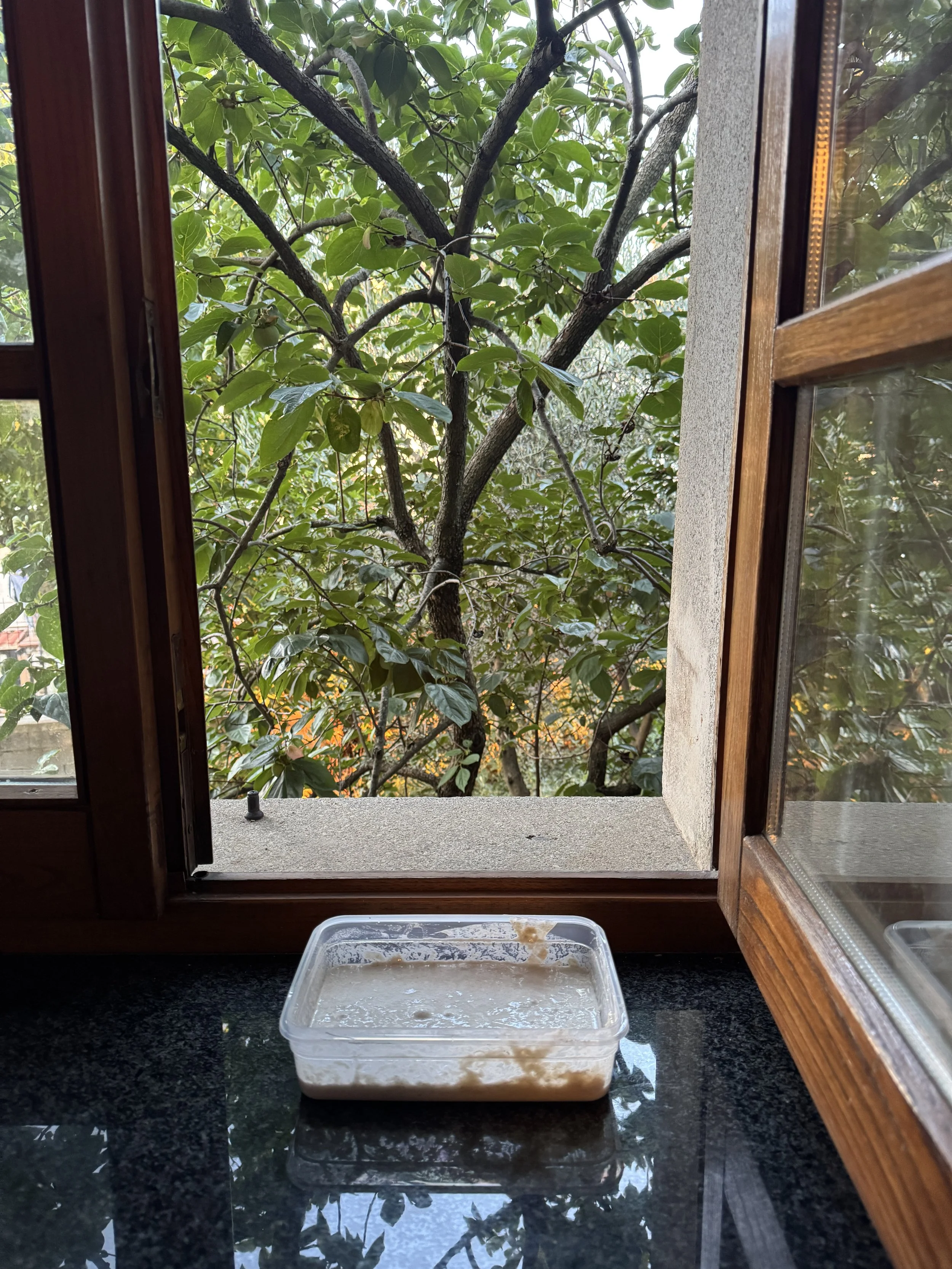 The mother is ready! I know this as it was full of bubbles this morning and when I feed it she talked back. My mother at home is a decade old so this young bubbly entity is a bit new and exciting. I wonder if the yeast that has infested my batter began in the peach tree outside the window?