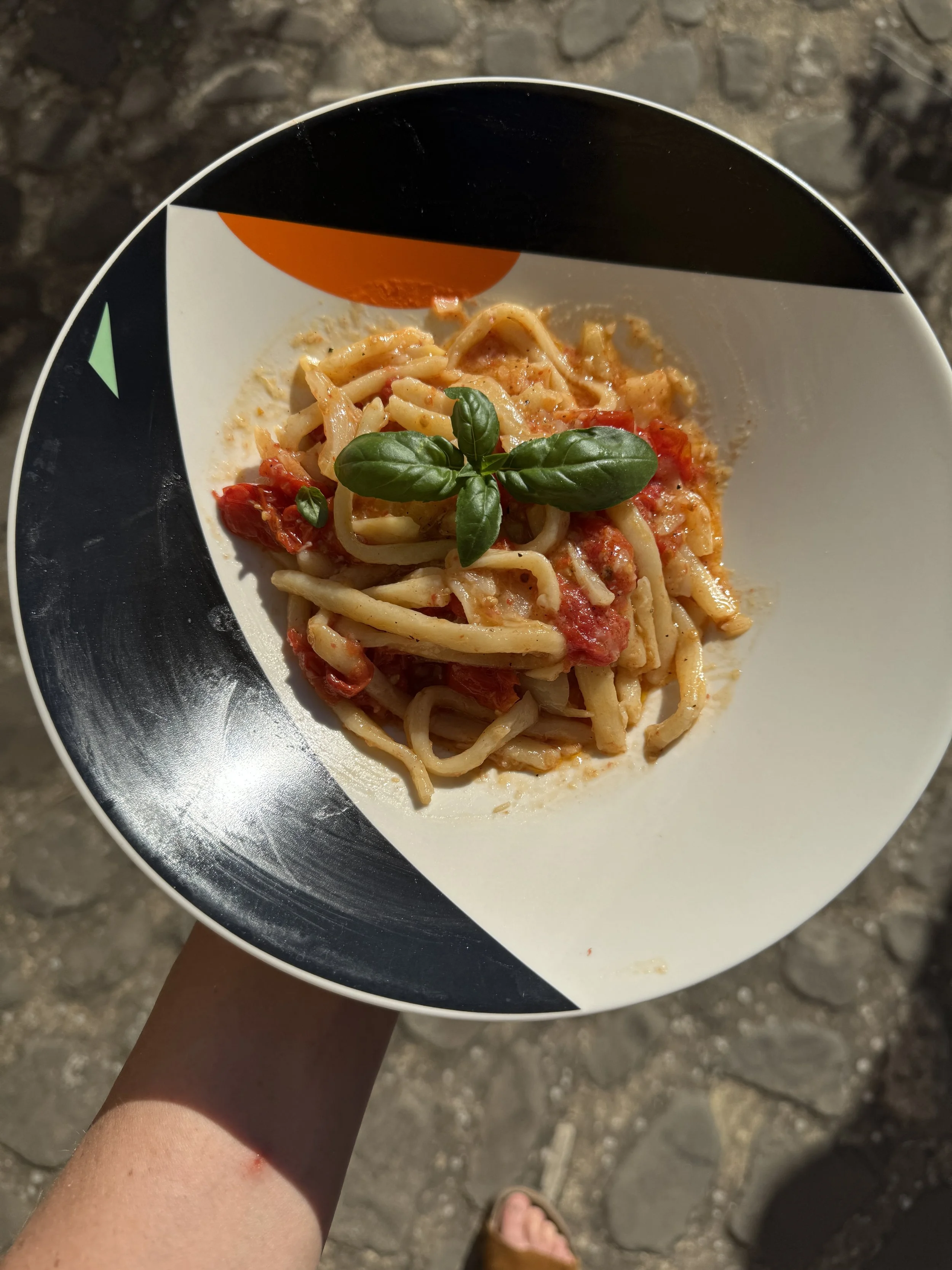 We were taken out to the foothills of Mount Amiata last night for a meal and were introduced to ‘pici’ (pronounced ‘peachy’) It is a Tuscano eggless pasta. Known for its chewy texture and its thick spaghetti shape it is most often served in Tuscano with a tomato, garlic sauce. In Tuscano there is a giant garlic called ‘aglione della valdichiana’ or ‘aglio elefante’ as you can guess translates to elephant garlic.. And I found some! In most of the recipes I found they used canned tomatoes but being surrounded by all this fresh produce I am going to ad lib the sauce by just roasting the tomatoes and garlic with olive oil salt and pepper.. Can’t wait!!